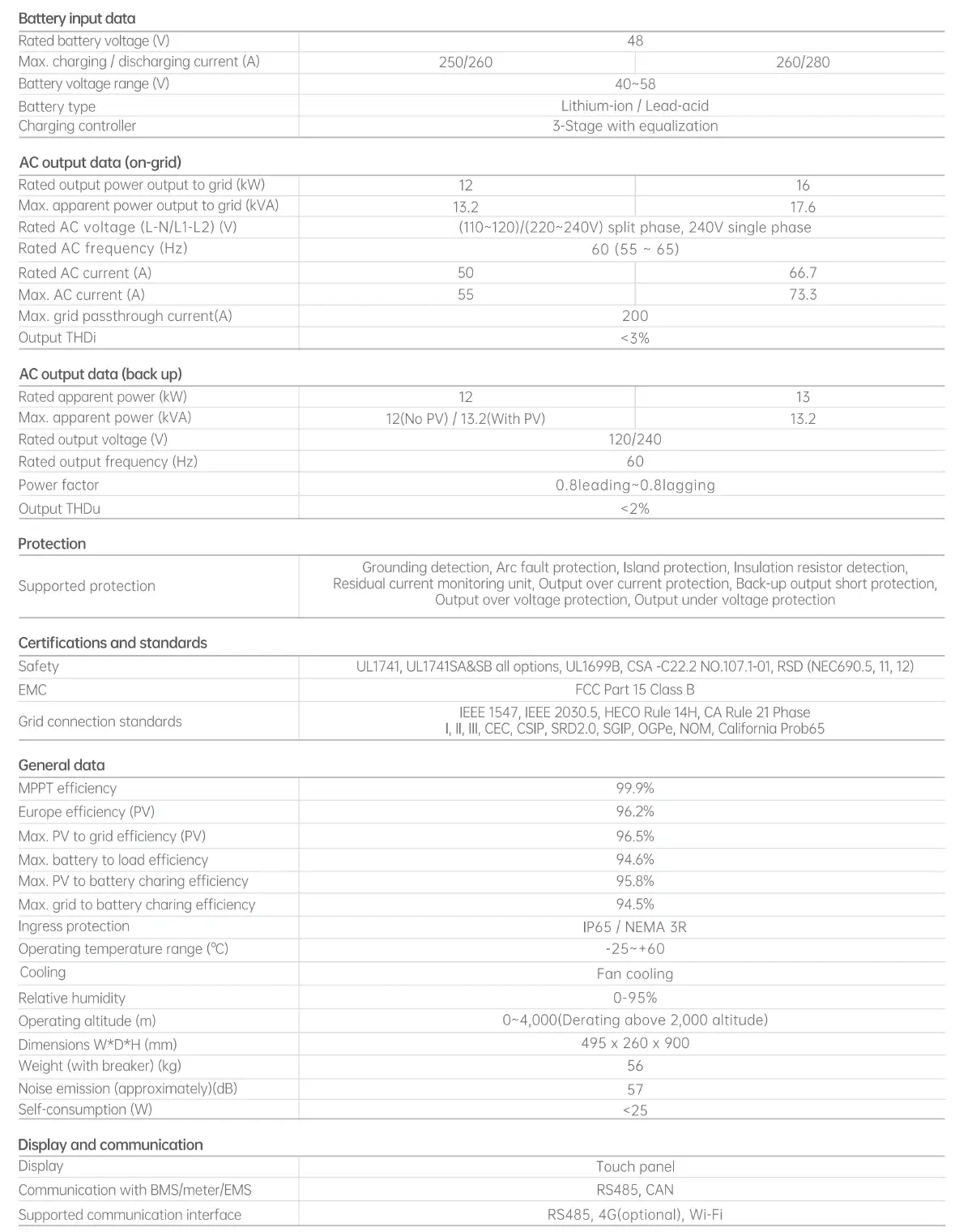 The R16KLNA supports both lithium-ion and lead-acid batteries with a rated battery voltage of 48V and a battery voltage range of 40–58V. It delivers a maximum charging current of 260A and a maximum discharging current of 280A, making it suitable for a wide range of energy storage capacities. The charging controller features a 3-stage with equalization strategy, ensuring optimal battery health and longevity.