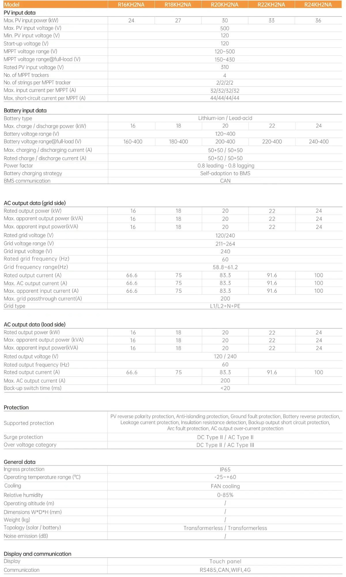 Comprehensive Battery Compatibility: The R24KH2NA supports both lithium-ion and lead-acid batteries, with a battery voltage range of 120V to 400V and a maximum charge/discharge power of up to 24kW. The inverter features self-adaptive BMS (Battery Management System) communication via CAN protocol, ensuring optimal charging strategies tailored to the specific battery chemistry and maximizing battery lifespan.